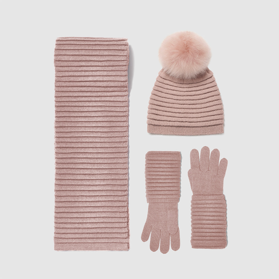 Sentaler women’s blush pink ribbed winter accessories set including hat, scarf, and gloves made of Baby Alpaca fabric displayed on a white background.