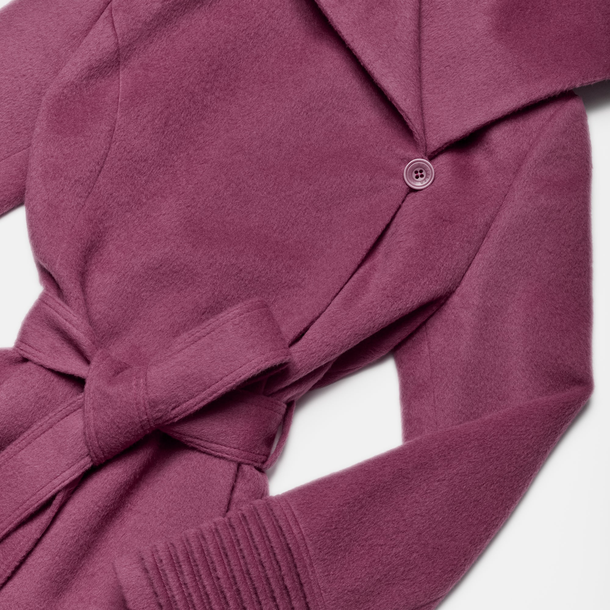 Sentaler Mid Length Hooded Wrap Mauve Pink Coat in Baby Alpaca wool. Seen as belted off figure with hood.