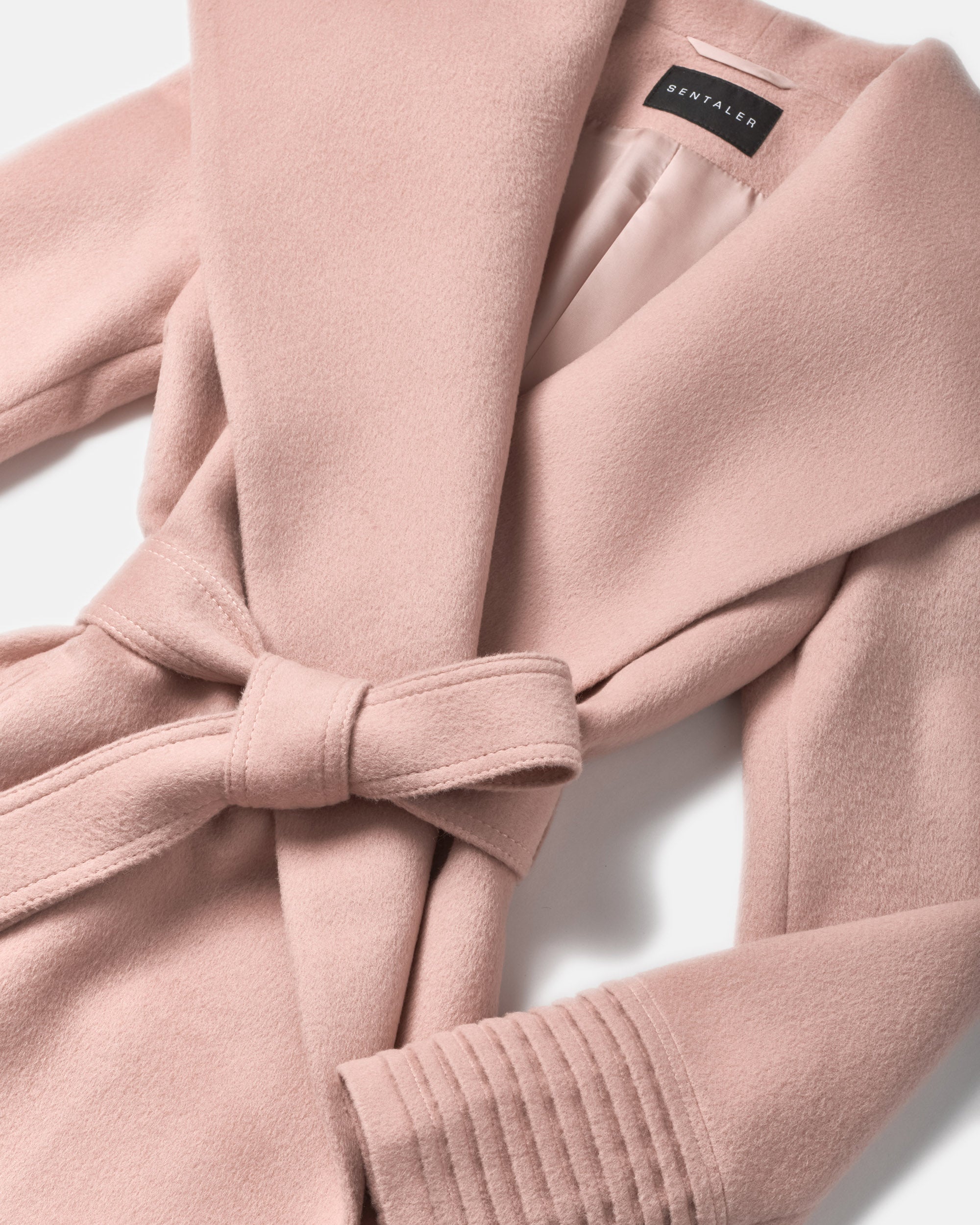 Sentaler mid length blush pink coat made of baby alpaca wool with a shawl collar, belted.